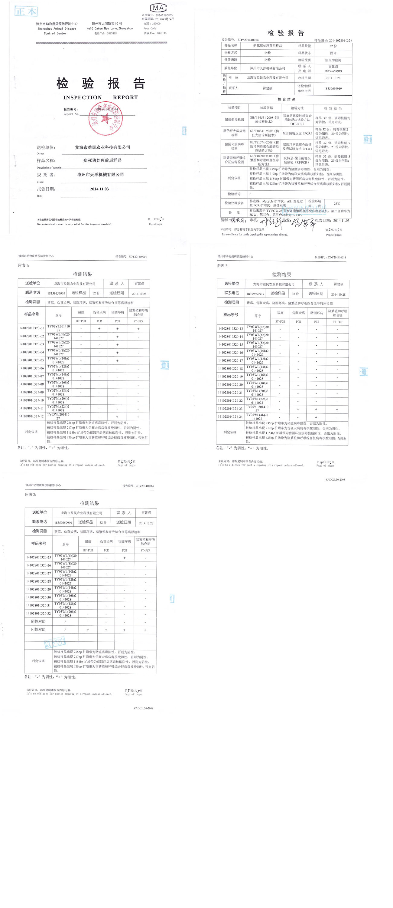 漳州市動物疫病預防控制中心檢驗報告--病死豬處理前后樣品檢驗